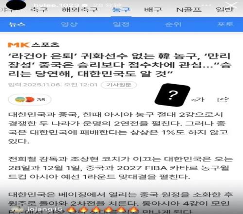 李贤重之前基本上没有更新过自己的社交媒体,但是在击败中国男篮后,他立马将之前韩国媒体报道的,韩国队很难战胜中国男篮的新闻截图上传,还打上了一个大大的问号。