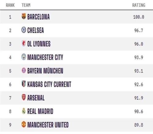 Opta女足俱乐部实力排名:巴萨女足满分居首,切尔西女足次席